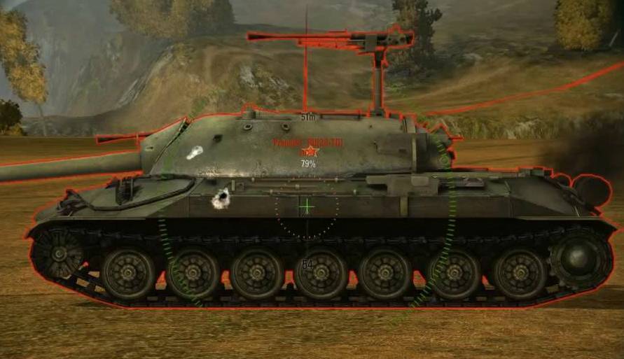 Углы вертикальной наводки неплохи, но и не идеальны, поэтому не всегда есть возможность стрелять из-за горки или любого укрытия без вреда самому ИС-7, ведь танк у нас не Маус и не Т30 (помните, выезжая из-за горки, вы подставляете нижний бронелист, что делать нельзя). Во время боя на открытой местности, стоит маневрировать, чтобы мешать врагу выстрелить по уязвимым точкам вроде нижнего бронелиста или люка мехвода, ведь у нас малые габариты и возможность промаха противника возрастает.