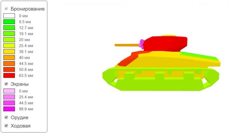 Если говорить о броне, она есть, но только когда мы вверху списка. Номинально у данного аппарата бронирование слабое, однако, во лбу корпуса весь ВЛД имеет неплохой наклон, что позволяет 50-миллиметровой бронеплите достигать даже 120 миллиметров в самом толстом месте. Если вы еще довернете корпус, что у M4 Sherman характеристики бронирования еще немного возрастут, что позволит отбивать некоторые снаряды одноклассников, но от техники 6-7 уровней не защитит.