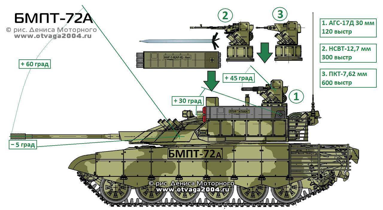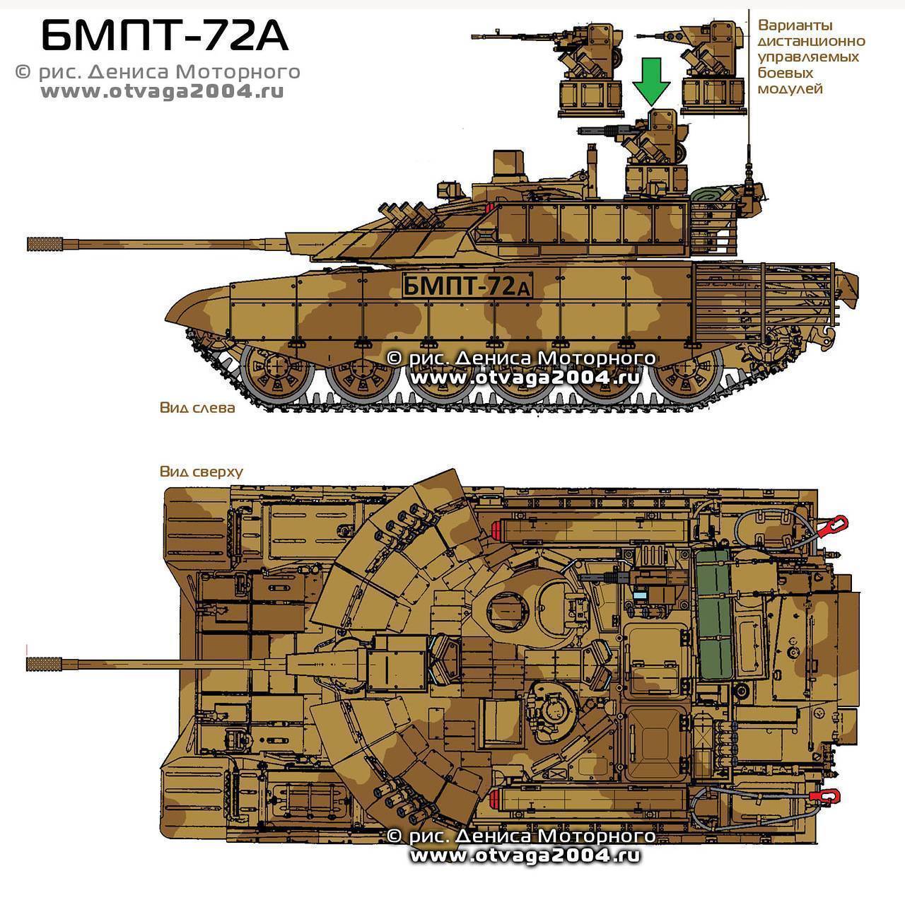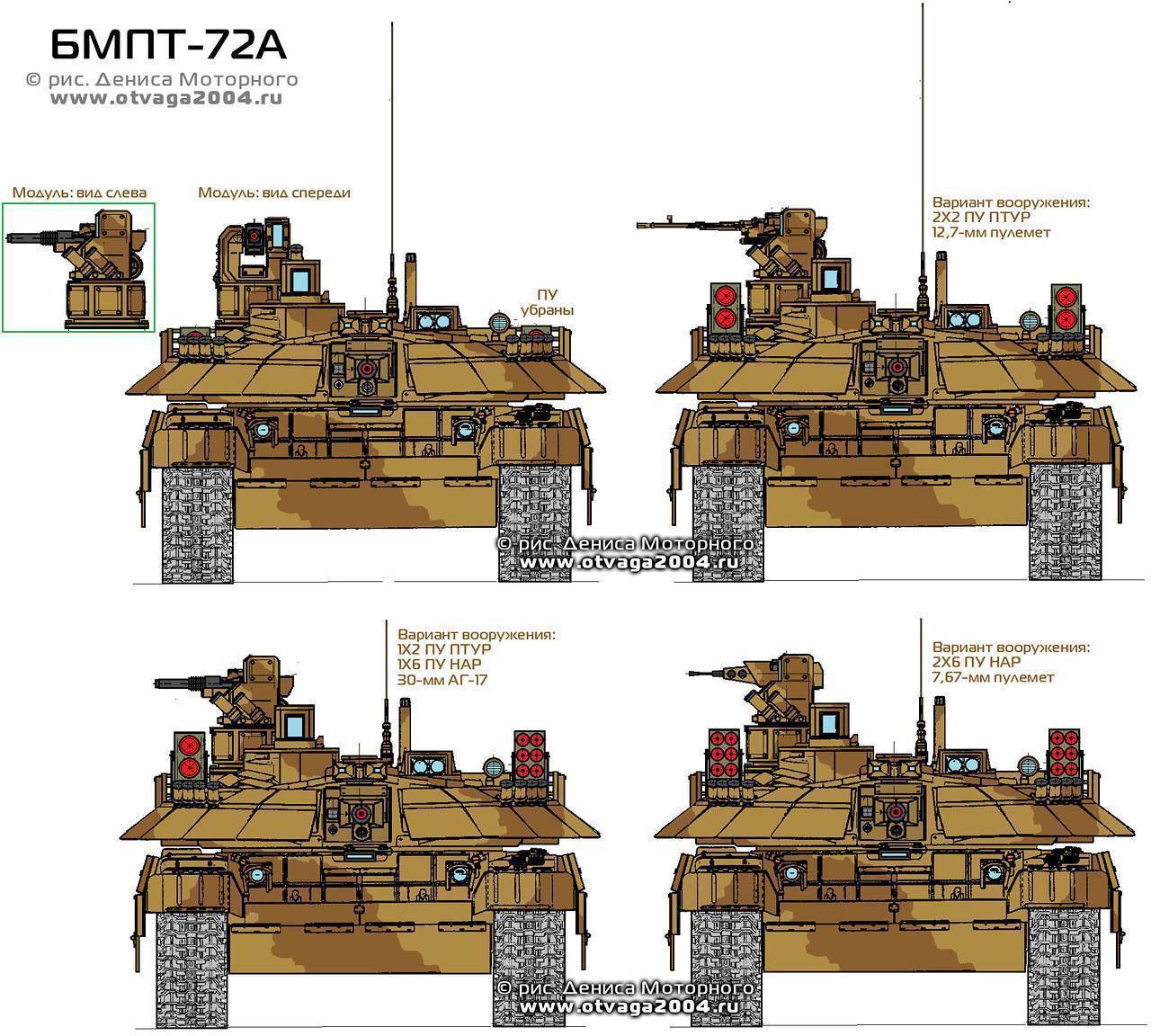 БМПТ-72А – машина поддержки танков на базе танка Т-72. Корпус танка при переделке в БМПТ остается неизменным. Изменениям подвергается башня танка – видоизменяется амбразура под установку 57-мм пушки С-60 и спаренного 7,62-мм пулемета ПКТ. К задней части башни прикреплен бронированный контейнер с автоматической боеукладкой на 76 выстрелов. На правой части контейнера находится дистанционно управляемая установка, вооруженная 30-мм автоматическим гранатометом и двумя мортирами для дымовых или осветительных гранат. По бокам башни расположены выдвижные пусковые установки ПТУР «Атака-Т», которые в походном положении защищены бронеэкраном с навесной динамической защитой.