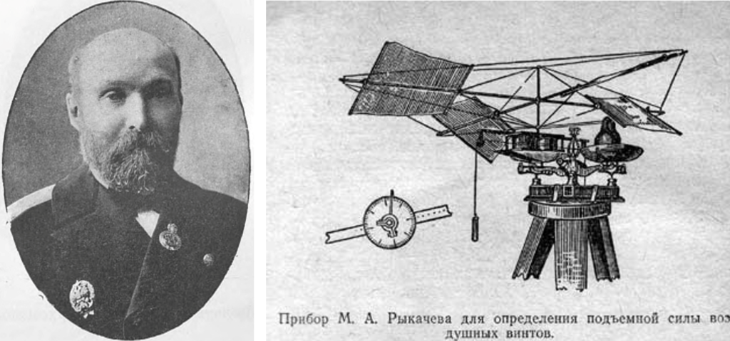 В 70-е годы XIX века много опытов провел русский ученый и академик Михаил Рыкачёв (1840 — 1919). Он сконструировал стенд для проверки свойств несущего винта и развиваемой подъемной силы.