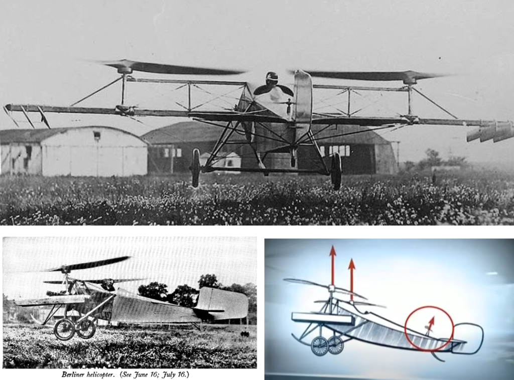 В 1922 году американец Генри Берлинер предложил оригинальную идею — по бокам фюзеляжа истребителя располагались два винта на поперечной балке, направленные вверх. В хвосте был еще один небольшой винт, который отклонял фюзеляж вертолета по тангажу (вперед-назад), создавая нужную силу для горизонтального движения. Как показали испытательные полёты, такой геликоптер плохо управлялся и был неустойчив в полёте.