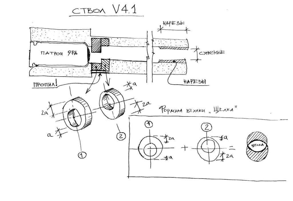 Вторым вариантом стал ствол со смещенными осями патронника и части, используемой для движения пули. В конструкции таких деталей есть дополнительные канавки, имитирующие нарезку, которые дополнительно ослабляют конструкцию.