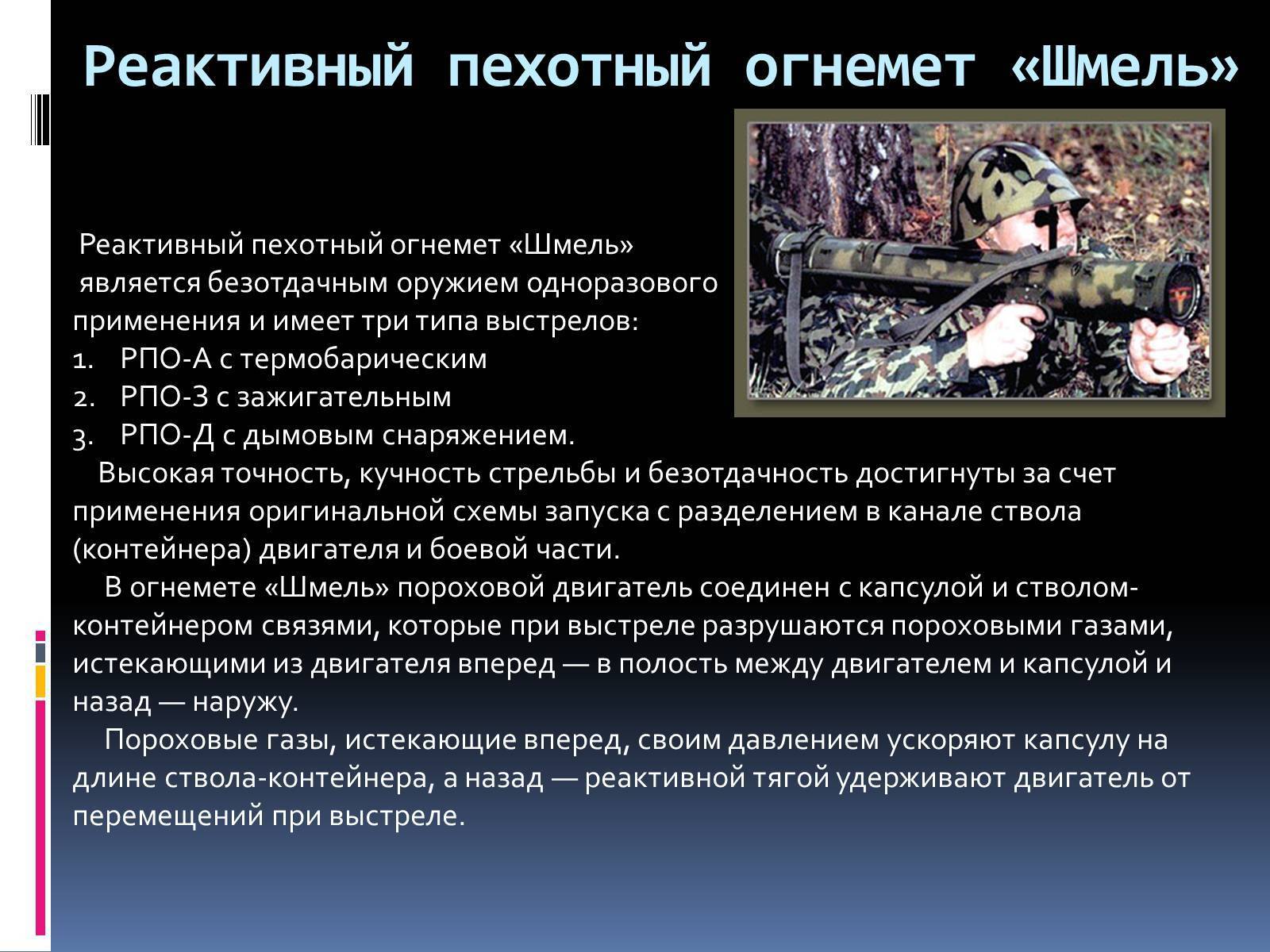 РПО-А «Шмель» (Реактивный Пехотный Огнемет) предназначен для поражения укрытых огневых точек противника, его легкобронированной и автомобильной техники, а также уничтожения живой силы противника. Разработан в 1976 году в Конструкторском бюро Приборостроения города Тулы (КБП). В конце 80х годов принят на вооружение Советской армии, заменив РПО «Рысь». Огнемет одноразового применения. Ствол-контейнер предназначен для транспортировки и пуска одной капсулы, после выстрела пустые контейнеры выбрасываются. Внутри ствола-контейнера расположена капсула с зажигательной смесью и пороховой двигатель. При выстреле пороховой двигатель разгоняет заряд в канале ствола и отделяется от заряда, вылетая назад вместе с пороховыми газами. Полет капсулы с огнесмесью стабилизируется хвостовым её оперением. Прицельные приспособления рамочного типа, с подвижным целиком. Разработаны следующие заряды: