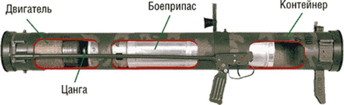 - Контейнер предназначен для производства выстрела, направления боеприпаса в цель и обеспечения герметичной упаковки оболочки со снаряжением и двигателя. Контейнер состоит из трубы с фланцами, на нём размещены: ударно-спусковой механизм, прицельное приспособление, ремень, узлы соединения во вьюк (передний и задний бандажи).
