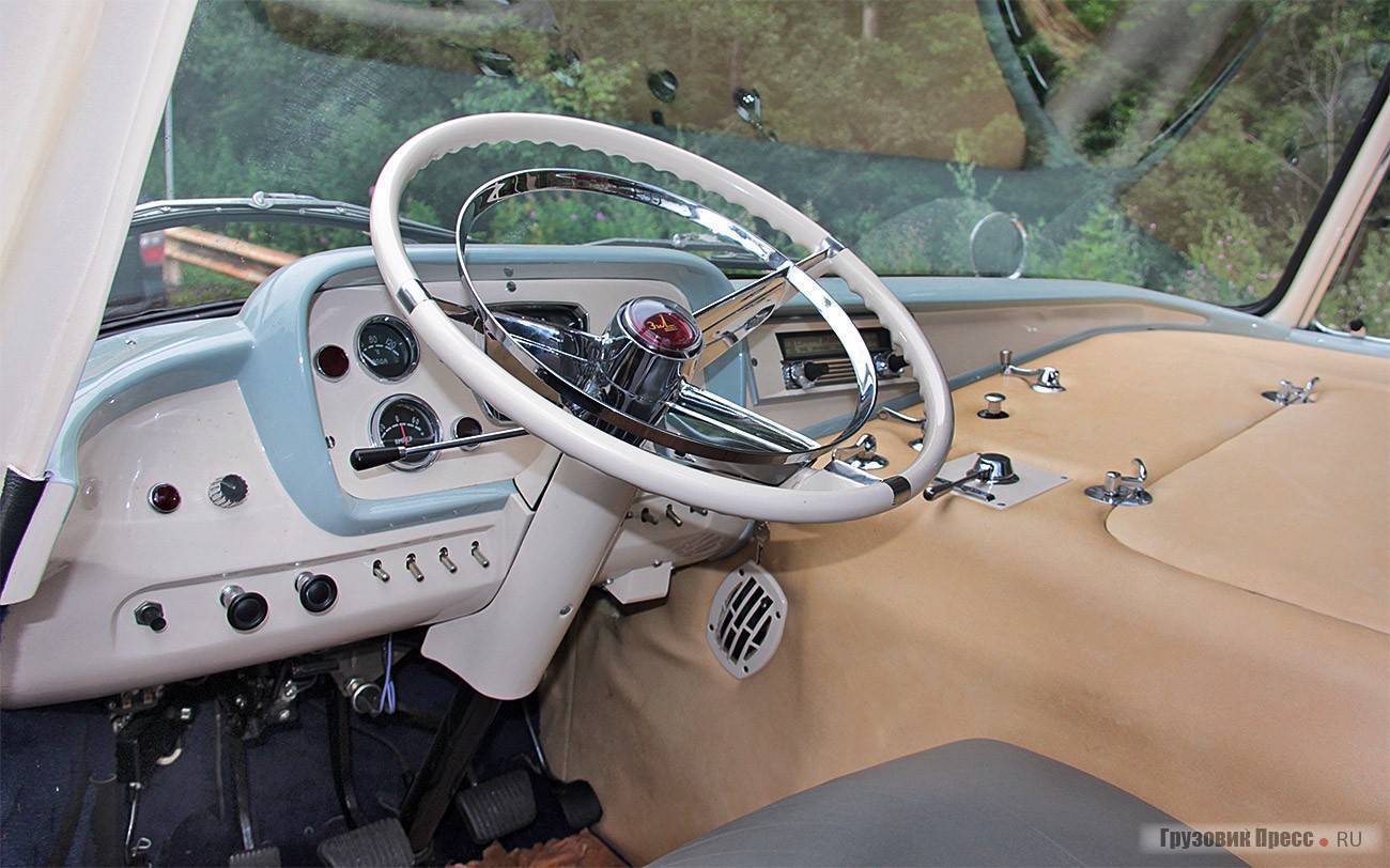 Обзор на рабочем месте – лучше не придумаешь! Я неплохо уселся, обнаружив две регулировки водительского сиденья (это немало для авто, разменявшего шестой десяток) с пухлой подушкой и короткой спинкой без подголовника. Глянул в маленькие кругляши зеркал заднего вида, установленные на отдельных хромированных «куриных ножках», попробовал на ощупь светлое и тонюсенькое по сегодняшним меркам рулевое колесо, в ступице которого красовался рубиновый, что кремлёвские звёзды на башнях, логотип автозавода.